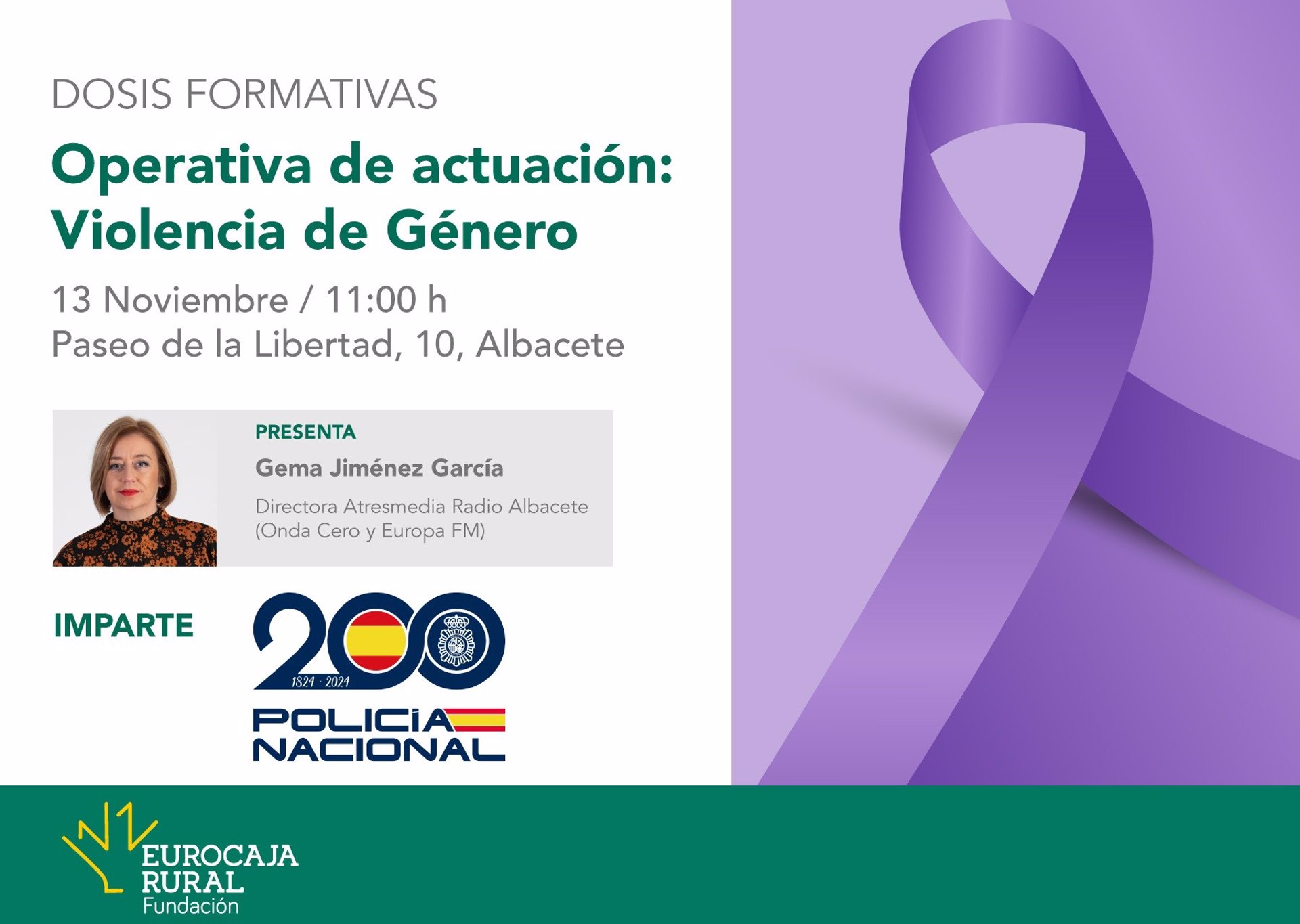 La Fundación Eurocaja Rural y el Área de Recursos Humanos y Responsabilidad Social Corporativa de Eurocaja Rural, en colaboración con el Servicio de Participación Ciudadana de la Policía Nacional de Albacete, celebrará el próximo 13 de noviembre, a las 11.00 horas, una nueva dosis formativa dedicada en esta ocasión a la violencia de género.