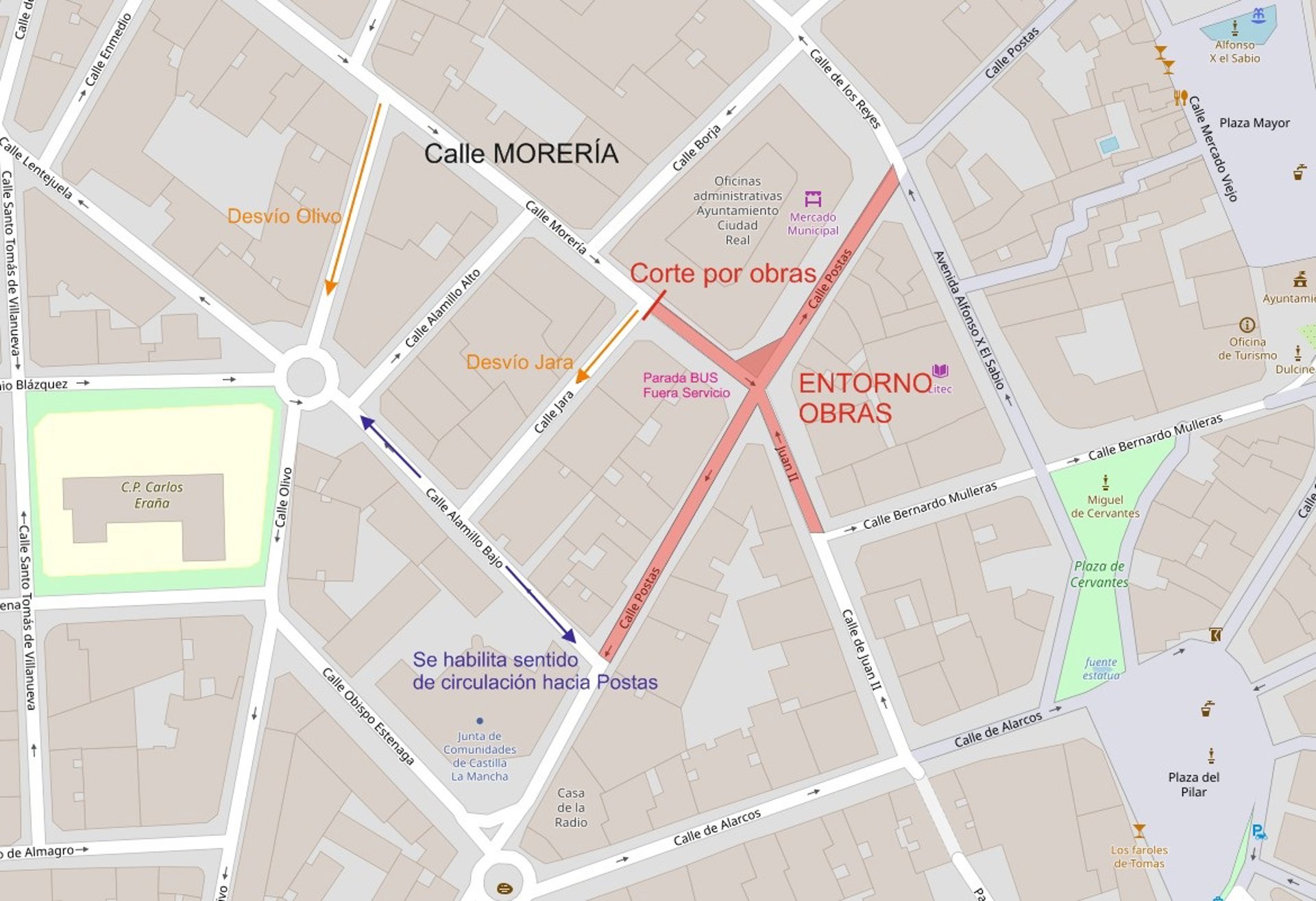 El acceso para residentes de la zona y el parking de la Plaza Mayor se realizará por la calle Alarcos, Plaza Cervantes (itinerario provisional habilitado) y Alfonso X. La salida se efectuará por la calle Borja, salvo para aquellos que accedan al parking de la Plaza Mayor.