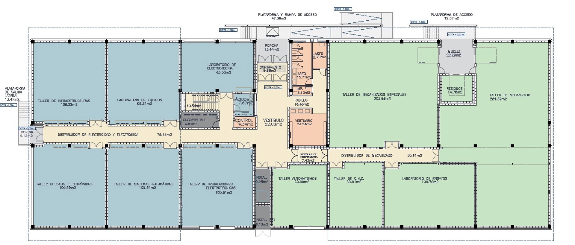 Según informa el Ejecutivo regional, el objeto del proyecto es realizar un nuevo edificio funcional y de altas prestaciones que permitirá alojar los talleres de las familias profesionales de electricidad-electrónica y mecanizado con unas prestaciones bien definidas; accesos cercanos al edificio de aulas y acceso rodado de material al muelle; construcción prefabricada de hormigón en estructura y cerramientos; reducido plazo de ejecución, zonificación de los espacios de las dos familias profesionales implantadas en él; terraza central para ubicación de campo fotovoltaico e instalaciones; espacio interior diáfano por utilización de vigas canalón de gran luz; forjado sanitario elevado para prevenir efectos de posibles inundaciones; y muelle con acceso directo a talleres de mecanizado y almacén de residuos.