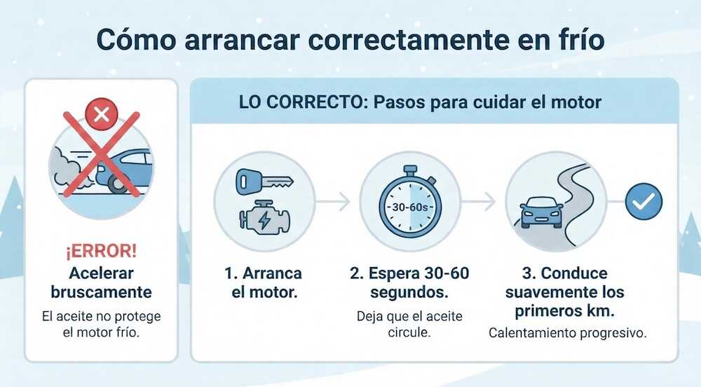 Acelerar bruscamente nada más arrancar el motor frío es uno de los errores más comunes. El aceite aún no ha alcanzado su temperatura óptima ni ha llegado a todos los rincones del propulsor. Esperar entre treinta segundos y un minuto antes de circular, y conducir suavemente los primeros kilómetros, alarga significativamente la vida útil del motor.