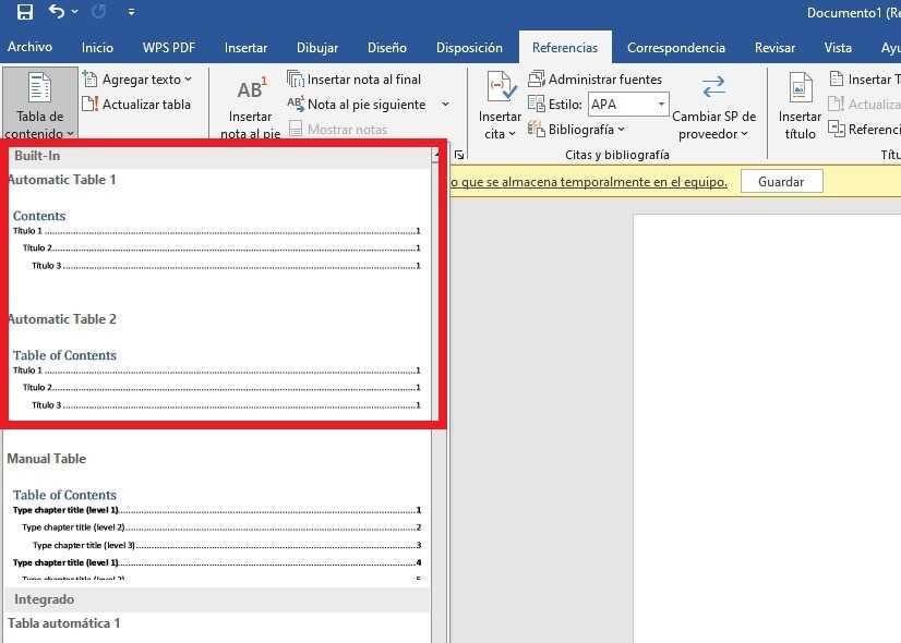 Haz clic en Tabla de contenido y selecciona tu estilo preferido.