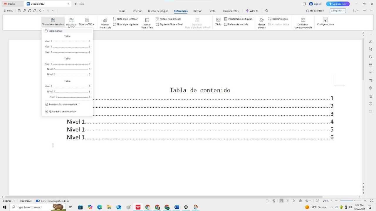 Haz clic dentro de tu TOC → abre el Panel de Estilos (pestaña Inicio). Modifica los estilos “TOC 1”, “TOC 2” y “TOC 3” para cambiar fuente, color o espaciado. Esto es esencial si tu empresa utiliza un diseño con identidad visual específica.