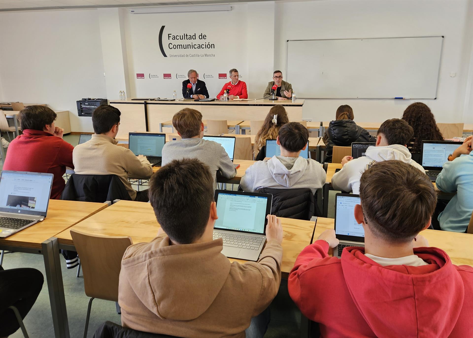 De la Rosa ha participado en un encuentro con estudiantes de 2º curso de Periodismo organizado por el profesor y periodista Juan Carlos Santos, junto al presidente de la patronal Cecam, Ángel Nicolás, para hablar del ejercicio del diálogo social en Castilla-La Mancha y la función de sus respectivas organizaciones.