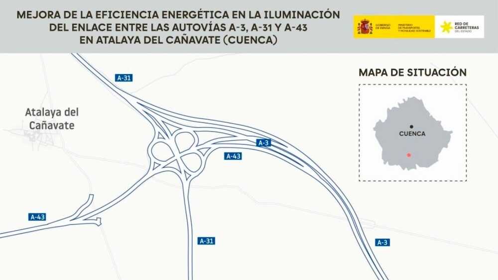El Ministerio de Transportes y Movilidad Sostenible ha licitado por 1.129.207,21 euros (IVA incluido) las obras de mejora de la eficiencia energética de la instalación de iluminación a cielo abierto del enlace de las autovías A-3, A-31 y A-43, en el término municipal de Atalaya del Cañavate, en la provincia de Cuenca.