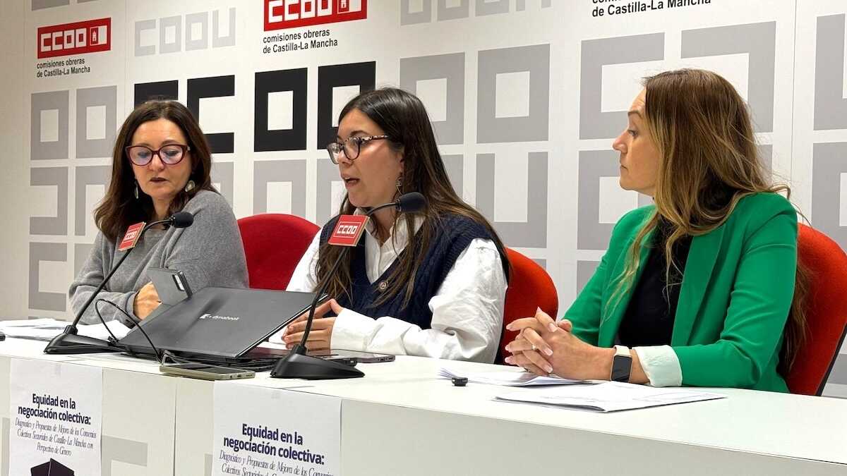 El diagnóstico forma parte de la guía Equidad en la negociación colectiva. Diagnóstico y propuestas de mejora en los convenios colectivos sectoriales de Castilla-La Mancha con perspectiva de género, presentada en rueda de prensa por la secretaria de Mujeres, Igualdad y Juventud de CCOO Castilla-La Mancha, Ana Villaseñor, junto a la directora del Instituto de la Mujer de Castilla-La Mancha, María Teresa López.