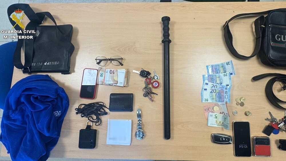 Como resultado del registro practicado en el turismo, se localizó una defensa semirrígida (similar a las utilizadas por la Fuerzas y Cuerpos de Seguridad del Estado) con la que habrían golpeado a la víctima, así como más de 2.000 euros en efectivo, teléfonos móviles y otros efectos.