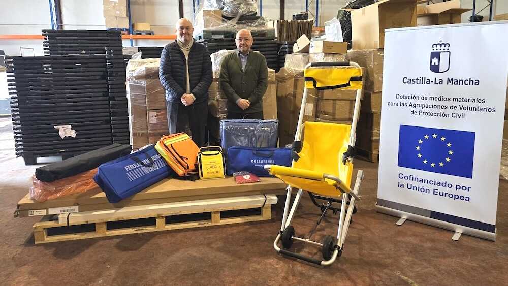 El Gobierno de Castilla-La Mancha ha comenzado a distribuir entre 39 entidades locales de la Comunidad Autónoma lotes de material de emergencias que será utilizado por sus respectivas agrupaciones de voluntarios y voluntarias de Protección Civil. Cada dotación de material consta de un desfibrilador semiautomático externo (DESA) homologado, silla de evacuación salvaescaleras, dos camillas de emergencias plegables, dos mantas térmicas de emergencias, una cama plegable de campaña, cuatro férulas adaptables, tres collarines cervicales y una mochila o maletín botiquín completo de emergencias.