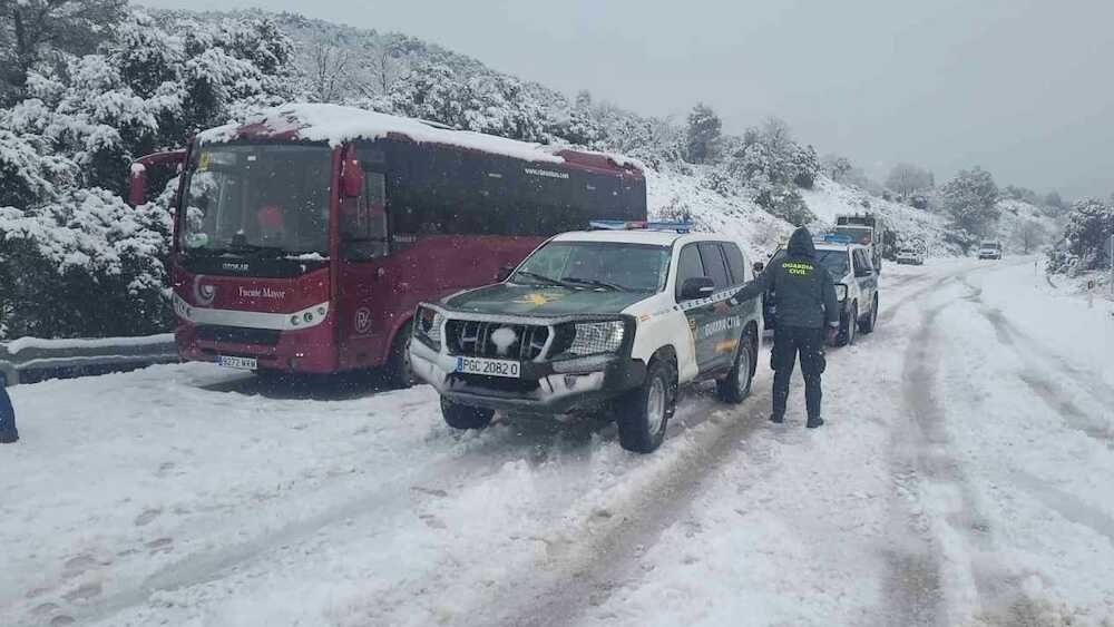 En el ámbito educativo, la Consejería de Educación ha elevado a 89 las rutas escolares canceladas en Castilla-La Mancha, lo que supone casi el nueve por ciento del total. Más de 1.600 alumnos se han visto afectados, principalmente en Guadalajara y Cuenca, donde se han registrado cancelaciones totales, recorridos parciales y regresos adelantados. Durante la mañana, la Guardia Civil rescató a cinco menores y a su cuidadora de un autobús escolar que quedó inmovilizado por la nieve en la N-320, a la altura de Alcocer, en la provincia de Guadalajara.