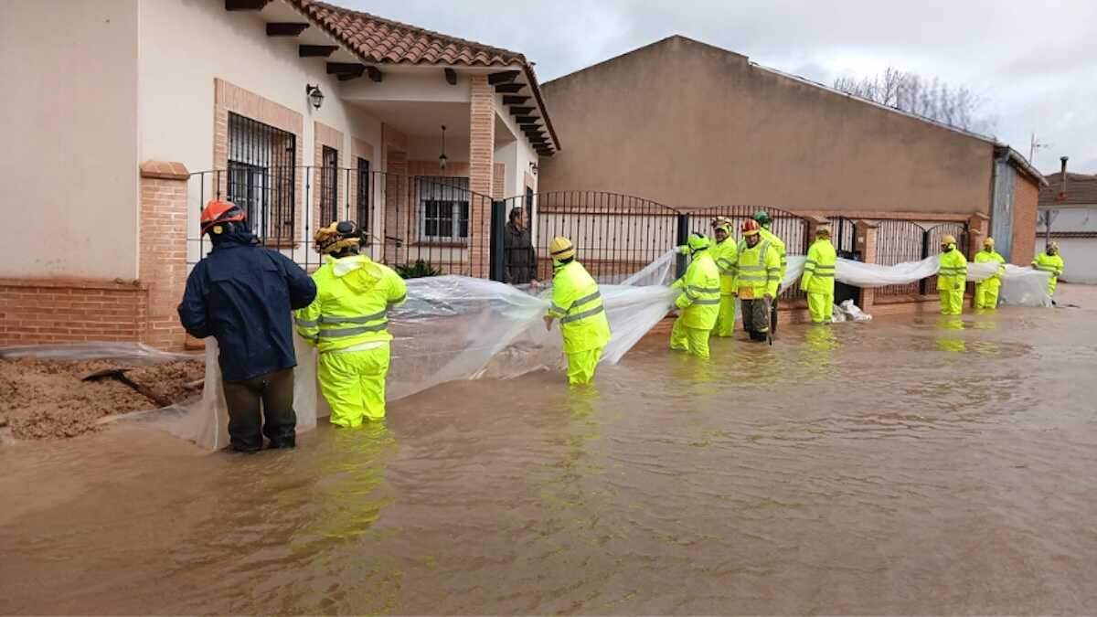 En la imagen trabajadores del Infocam realizando tareas de retirada de agua acumulada y construcción de diques de contención en El Robledo (Ciudad Real)