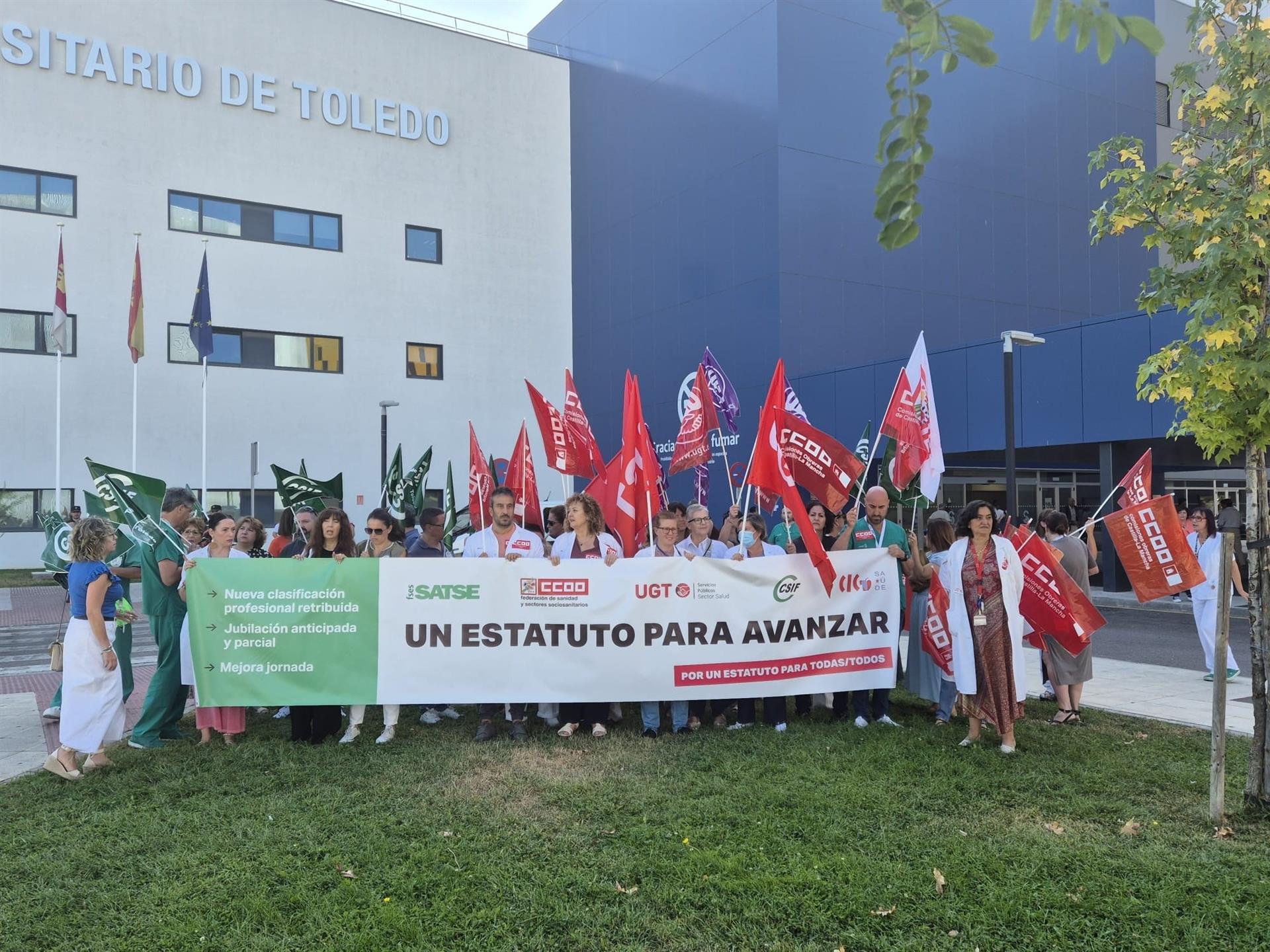 Miles de profesionales del Sistema Nacional de Salud (SNS) salieron este martes a las calles en toda España y, en particular, en Castilla-La Mancha, para denunciar el “bloqueo” en la negociación del nuevo Estatuto Marco y exigir que la norma recoja mejoras laborales largamente reclamadas. Las concentraciones, convocadas por SATSE-FSES, FSS-CCOO, UGT, CSIF y CIG-Saúde, se desarrollaron de forma simultánea frente a los hospitales de las cinco capitales de provincia de la región, con una notable participación de trabajadores de todas las categorías.