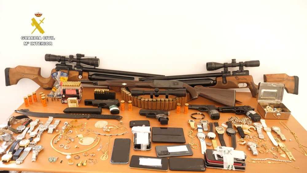 Finalmente, se realizaron nueve entradas y registros en los inmuebles vinculados a la organización. En concreto, dos en Toledo y siete en Cáceres. En los registros se ha intervenido una cantidad aproximada de 20.000 euros en efectivo, joyas y otros efectos sustraídos, dos turismos, una autocaravana y diverso material utilizado para cometer las estafas. Además, se ha incautado un arma modificada para efectuar disparos en modo ráfaga, siete armas de aire comprimido, una carabina y una elevada cantidad de munición.