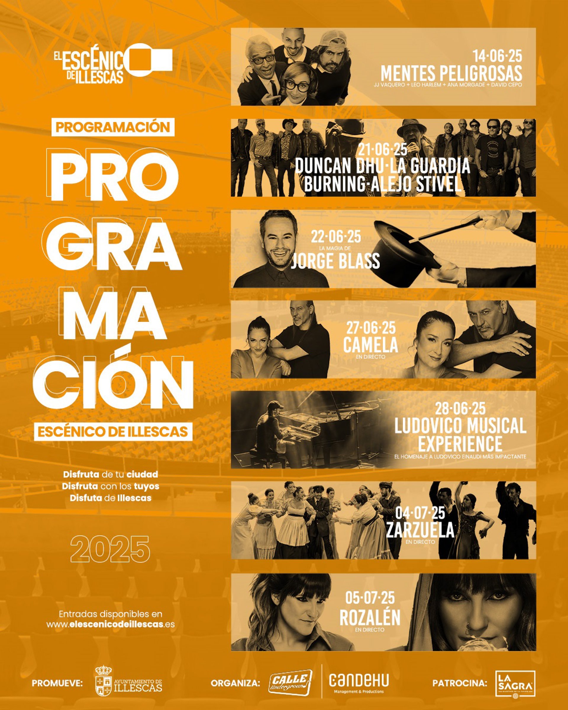 Las entradas ya se han puesto a la venta a través de la página web www.elescenicodeillescas.es. La Concejalía de Fiestas sigue apostando por la música y los espectáculos en directo, completando la programación cultural habitual de la primavera y el verano en la localidad, dando protagonismo a un espacio versátil. En cuanto a las y los artistas elegidos, se ha tenido en cuenta la diversidad del público illescano y a todas las edades.