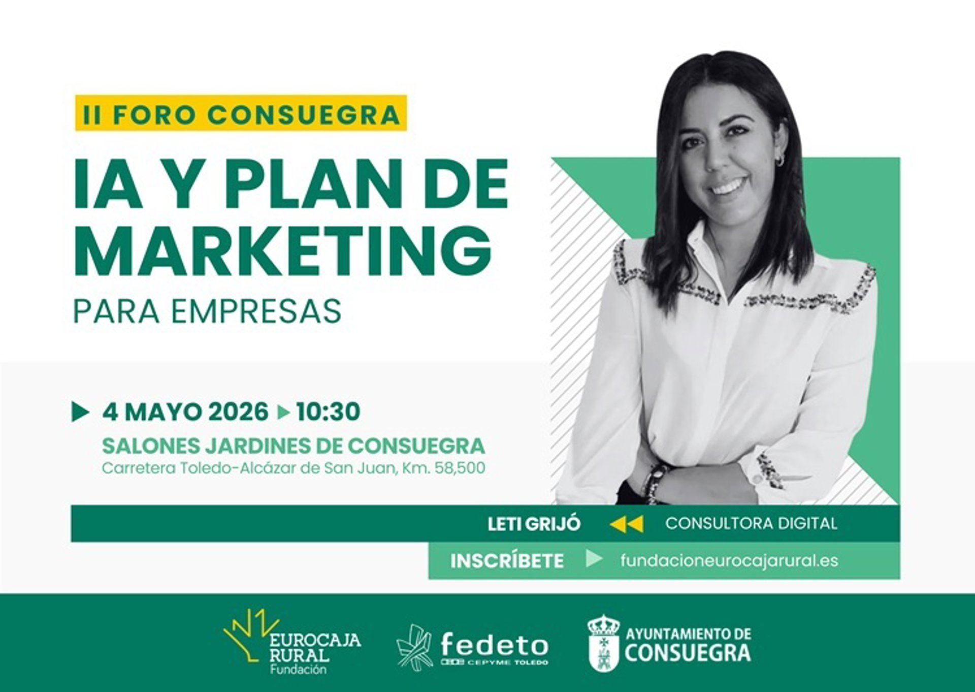 La Fundación Eurocaja Rural y la Federación Empresarial de Toledo (Fedeto) han convocado para el lunes 4 de mayo una jornada formativa gratuita en Consuegra (Toledo) dirigida a empresas y profesionales de la localidad y su comarca que quieran incorporar herramientas de Inteligencia Artificial a su comunicación y sus estrategias de marketing. La sesión, titulada 'IA y Plan de Marketing para empresas', se desarrollará de 11.00 a 12.30 horas en los Jardines de Consuegra y cuenta con el apoyo del Ayuntamiento de la ciudad manchega, según informó Eurocaja Rural en nota de prensa.