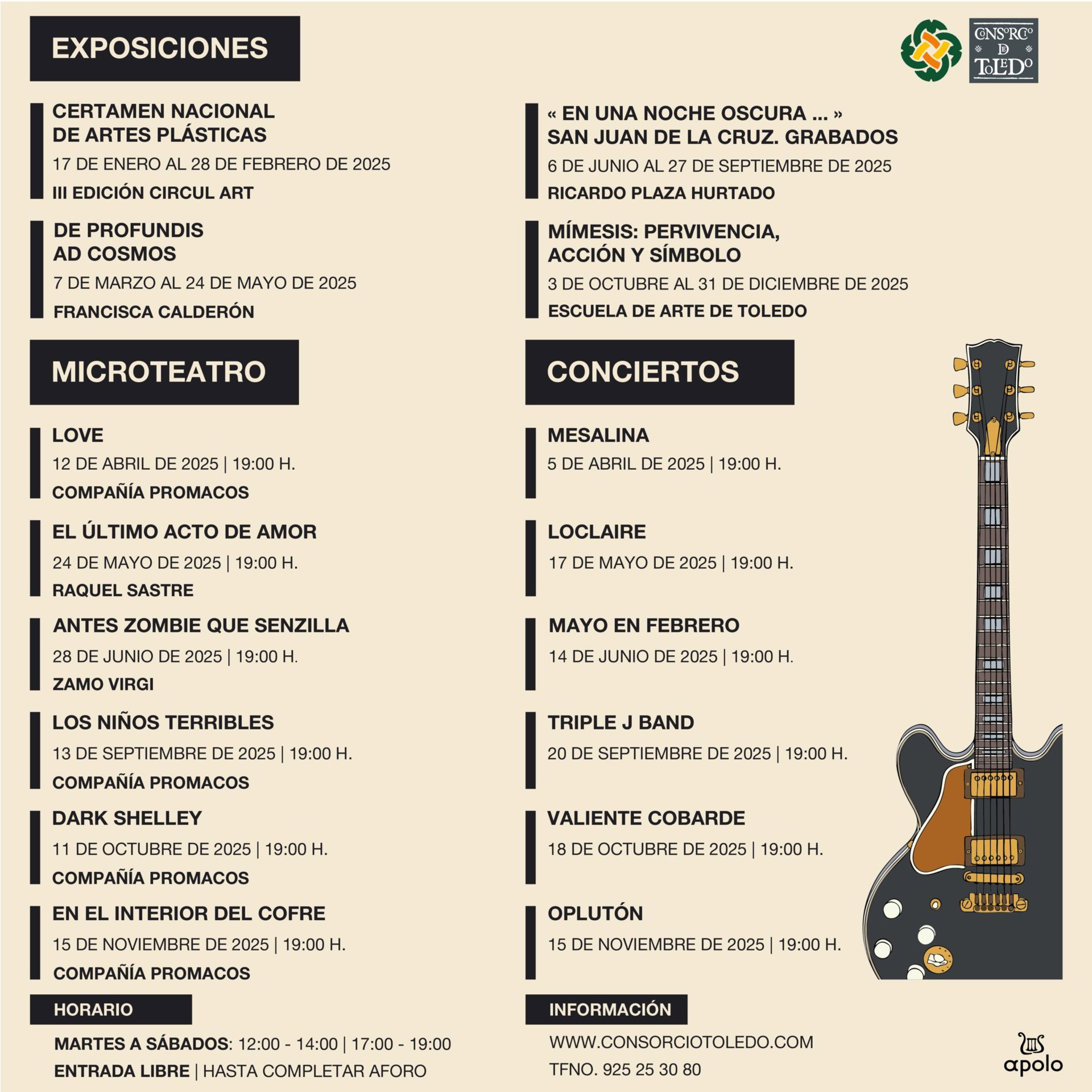A partir del 7 de marzo y hasta el 24 de mayo, Francisca Calderón presentará De profundis ad cosmos, una exposición que invita a viajar entre lo terrenal y los cósmico. Del 6 de junio al 27 de septiembre, Ricardo Plaza Hurtado exhibirá En una noche oscura San Juan de la Cruz, una colección de grabados inspirados en la obra del místico. Finalmente, del 2 de octubre al 31 de diciembre, la Escuela de Arte de Toledo traerá Mímesis: Pervivencia, acción y símbolo.