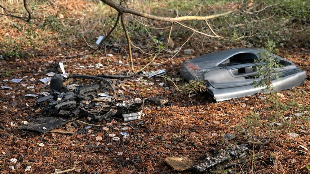 Restos del vehículo siniestrado tras el accidente de tráfico ocurrido de madrugada en San Román de los Montes (Toledo), en el que fallecieron dos jóvenes.