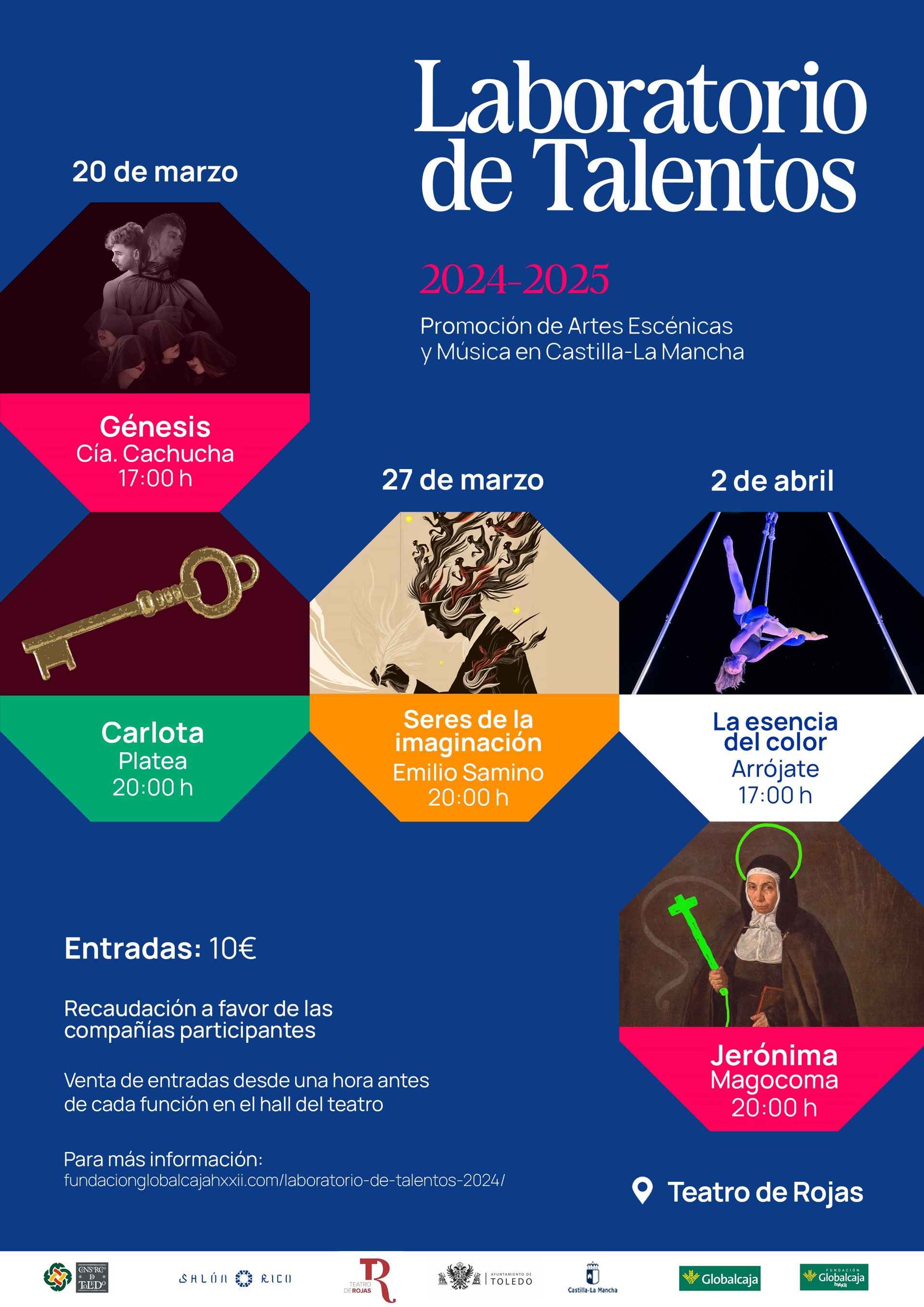 En otro orden, Laboratorio de Talentos, el programa de Globalcaja, a través de su Fundación Globalcaja HXXII, el Consorcio de la Ciudad de Toledo y la Consejería de Educación, Cultura y Deportes para promover las artes escénicas y musicales de Castilla-La Mancha, inicia una nueva fase con la representación de diferentes espectáculos en el toledano Teatro de Rojas durante el mes de marzo.