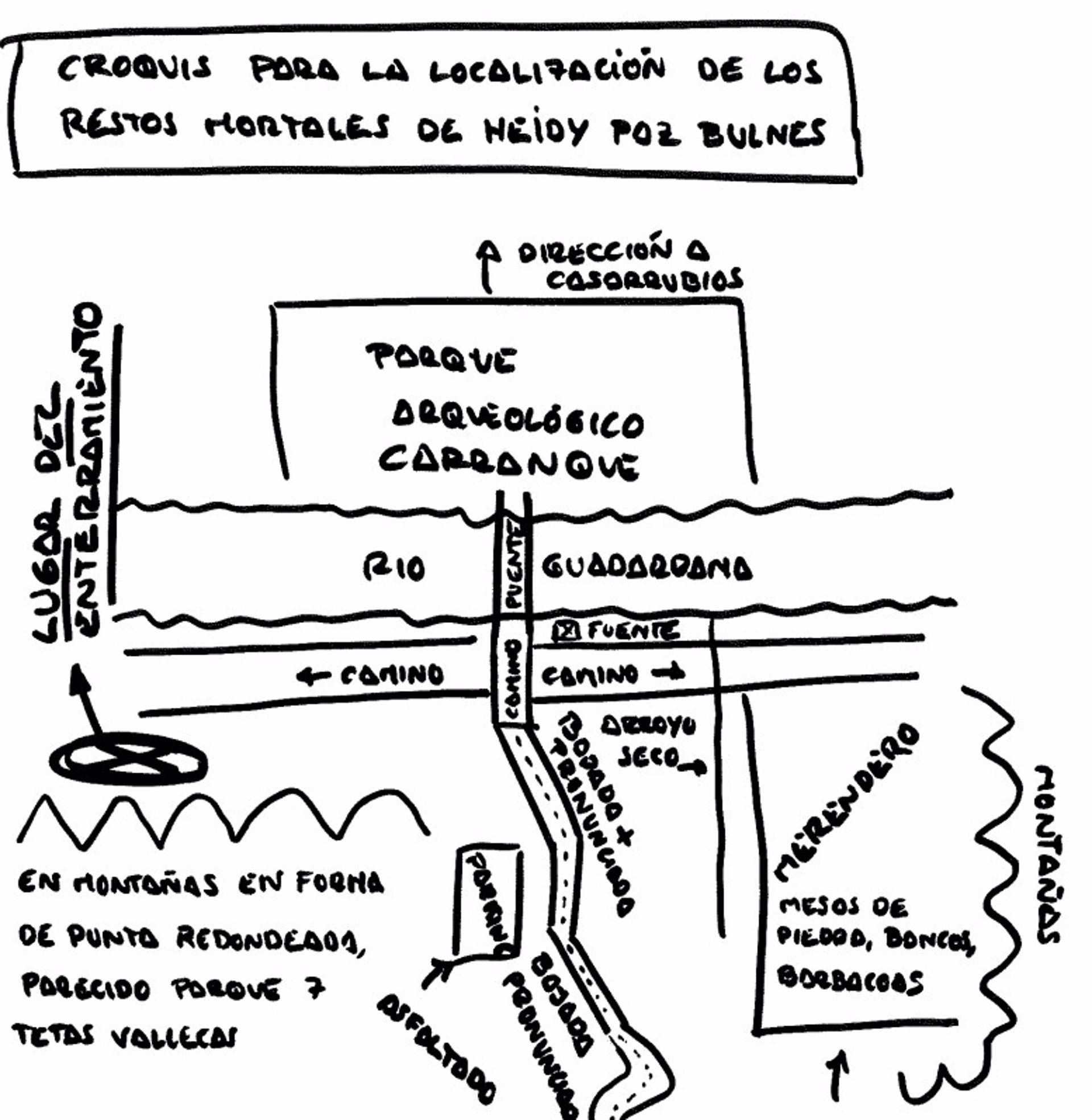 Sin embargo, señalaba que no conoce el lugar exacto dado que no lo acompañó. El escrito iba acompañado de un plano de la situación y la zona, según la recuerda, para "favorecer su localización y se ofrece a aportar cuantos detalles conozco y que entiendan necesarios para la localización".